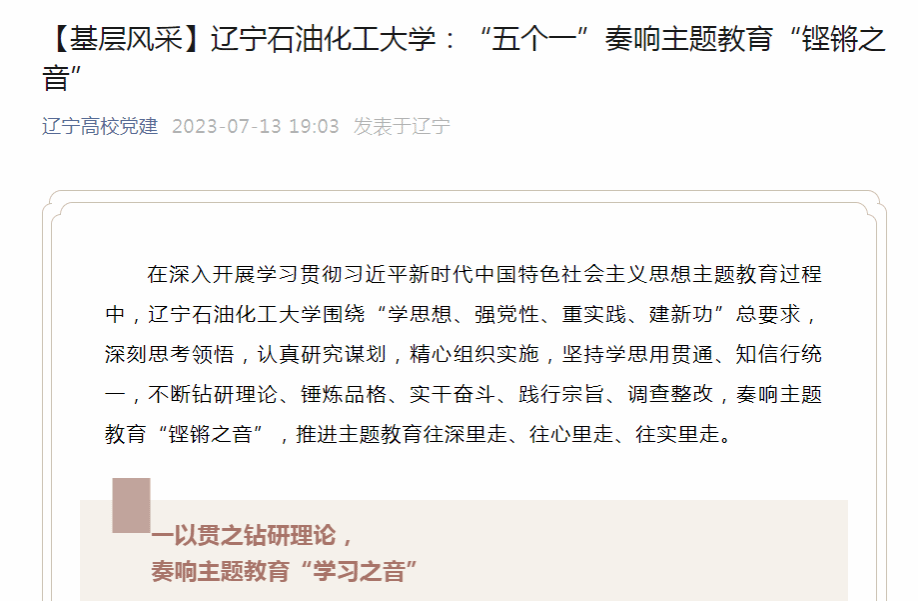 编者按:近日,全国高校思想政治工作网、辽宁高校党建微信公众号、辽宁日报·北国号等媒体平台对我校围绕“学思想、强党性、重实践、建新功”总要求,深刻思考领悟,认真研究谋划,精心组织实施,坚持学思用贯通、知信行统一,不断钻研理论、锤炼品格、实干奋斗、践行宗旨、调查整改,奏响主题教育“铿锵之音”,推进主题教育往深里走、往心里走、往实里走进行了宣传报道。现将相关报道转载如下: