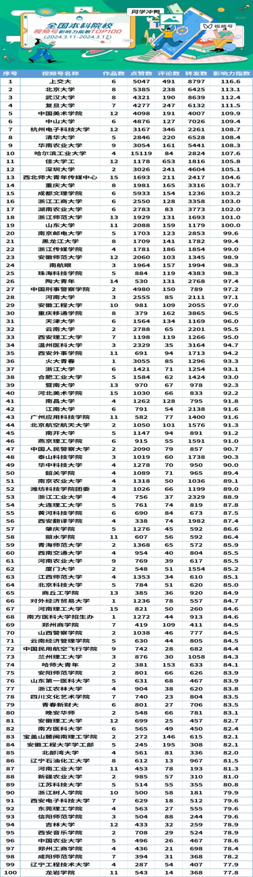 中青校媒微信公众号:全国高校(本科院校/职业院校)视频号影响力指数(2024.3.11-2024.3.17)-国产亚洲综合一区二区三区_亚洲欧美日韩中文天堂_尤物在线观看视频不卡无码_国产最新精品亚洲2025不卡_亚洲成Av人在线观看片水蜜桃